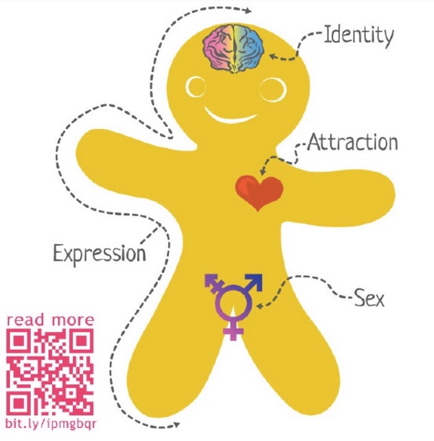 A great place to start is to examine, contemplate and introduce students to the wide range of expression that is possible for both sexual and gender identities. Here is the Genderbread Person to explain how complex this is! The scales below the Genderbread person prompt you to consider the infinite possibilities for sexual and gender identity, expression and sexual behavior/attraction. Take some time to consider these illustrations, consider ways you can change how you approach sexual and gender identity in your teaching, and share your ideas here! (You can download a PDF file of these illustrations here, and if you scan the QR code below you will find more explanation!)